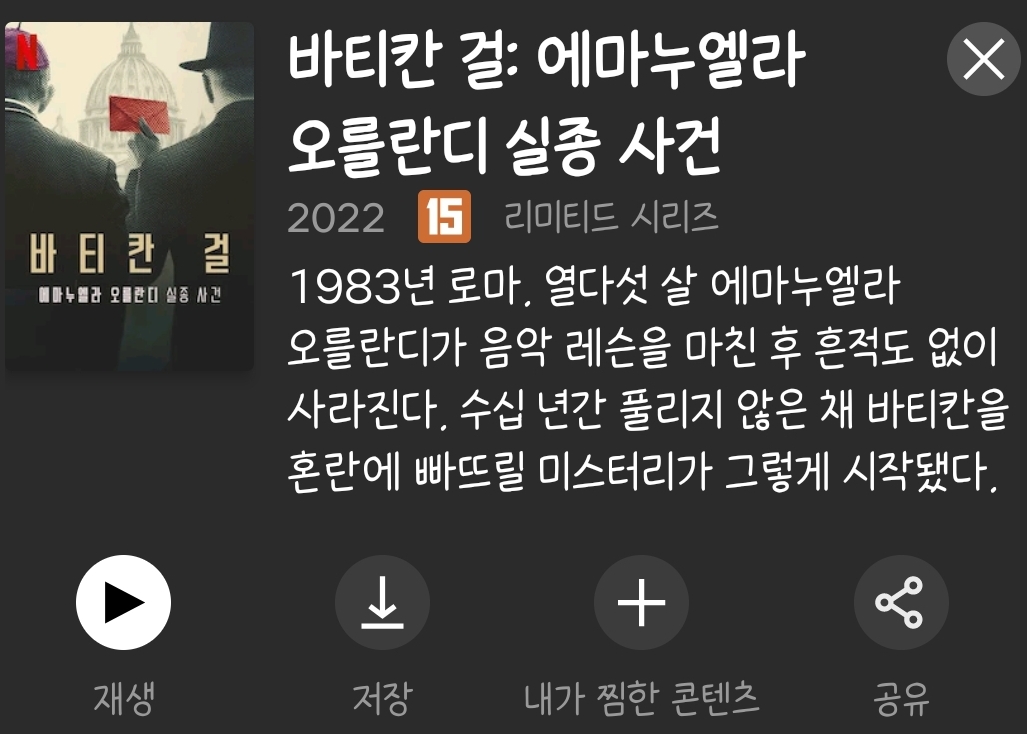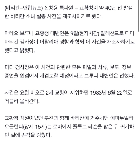 1983년 바티칸에 살고 있는 15살 여학생이 납치를 당했습니다. 러시아 정부, 이탈리아 마피아 등 다양한 가설과 증인이 등장했는데, 가족이 교황에게 알고 있느냐고 묻자 교황은 "그 아이는 천국에 있다."고 대답했다 합니다. 지지부진하게 미해결로 종결되었으나 넷플릭스 다큐 제작으로 일이 커지니까 다시 재조사하는 듯 하네요.