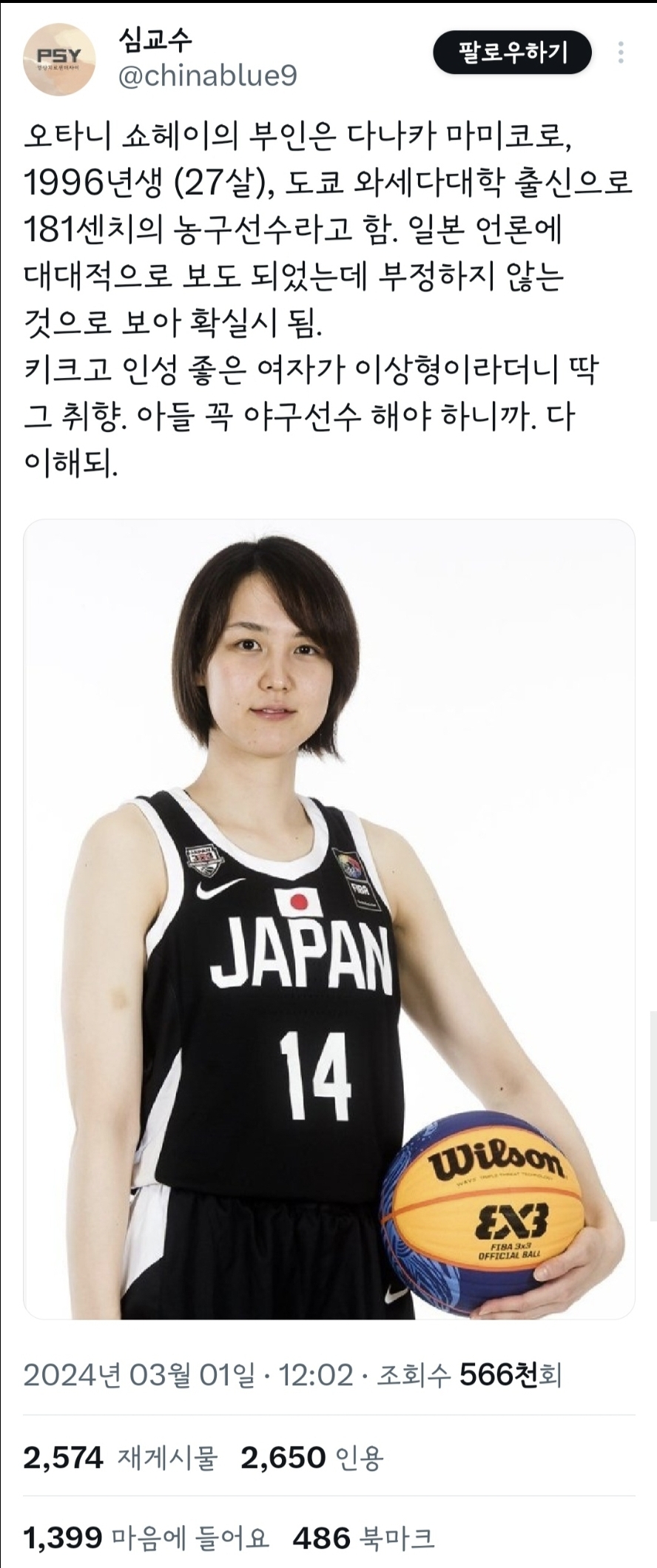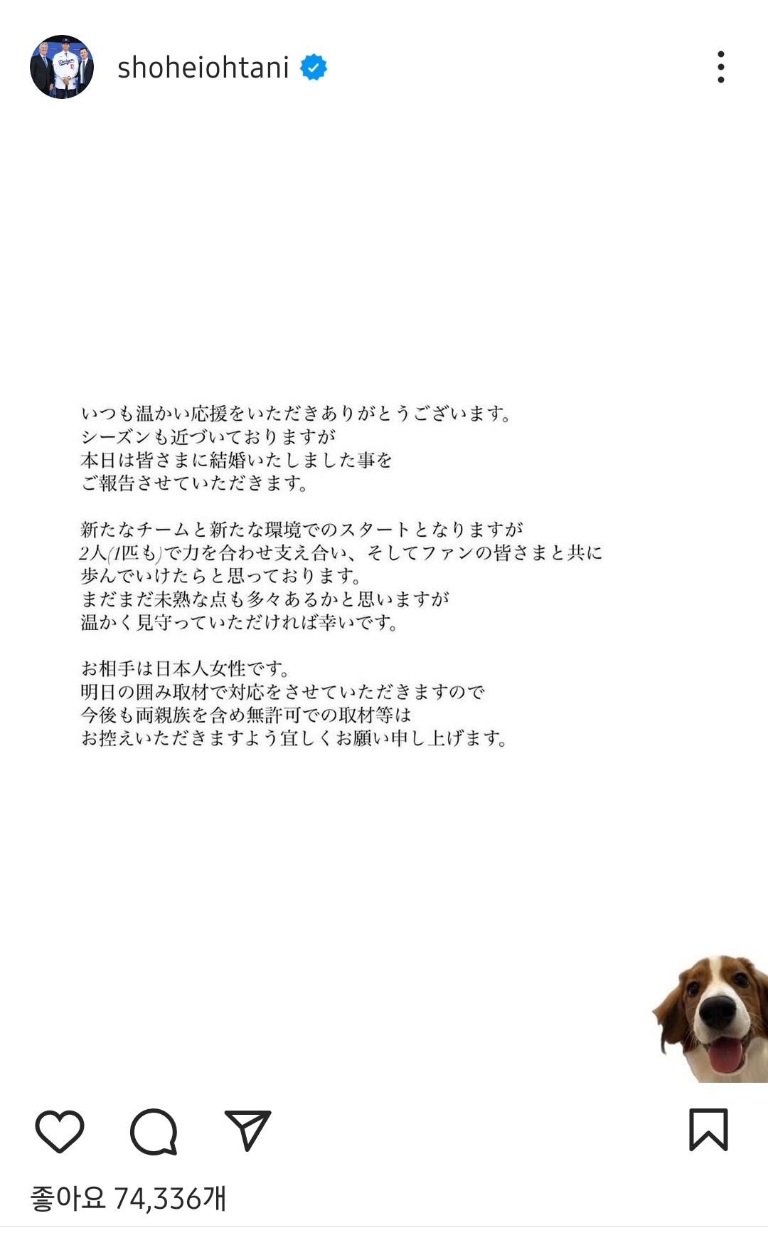 LA다저스 투수 오타니 쇼헤이(30살)이 결혼을 했다규 자신의 인스타그램에 발표했습니다.