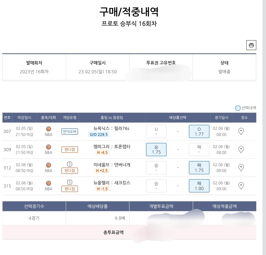 2월 5일 NBA 적중 내역