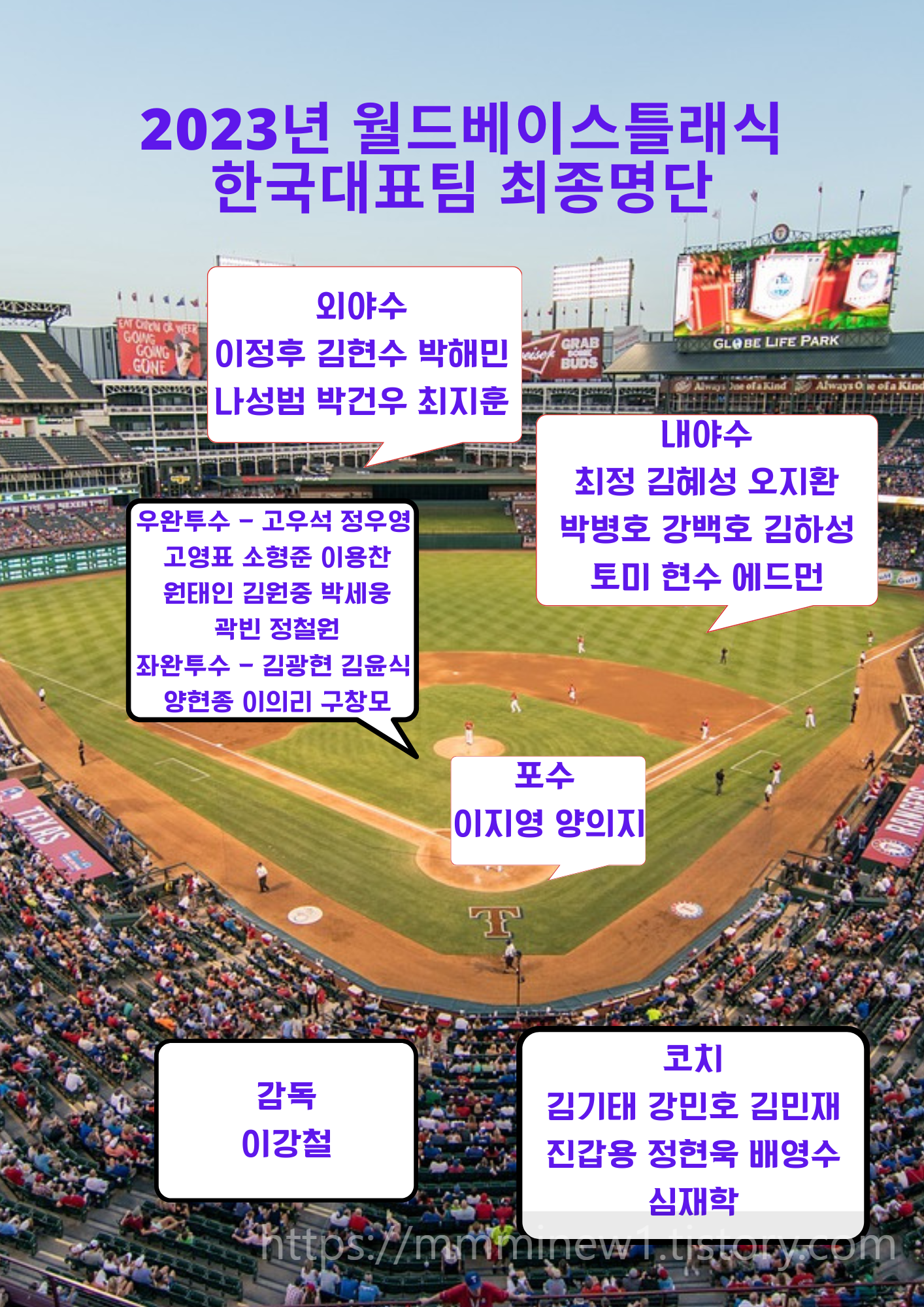 6년만에 열리는 제 5회 WBC(World Baseball Classic)가 한국 표준시 기준 3월 8일 수요일 오후 1시 대만 타이청에서 쿠바와 네델란드의 경기로 시작을 알립니다. 4개의 조에 5개국이 참가하여 예선전을 벌인다고 하는데요 예선전 경기장이 다 다른 국가이니까 관심있는 나라의 경기를 잘 체크하셔야 하겠습니다.