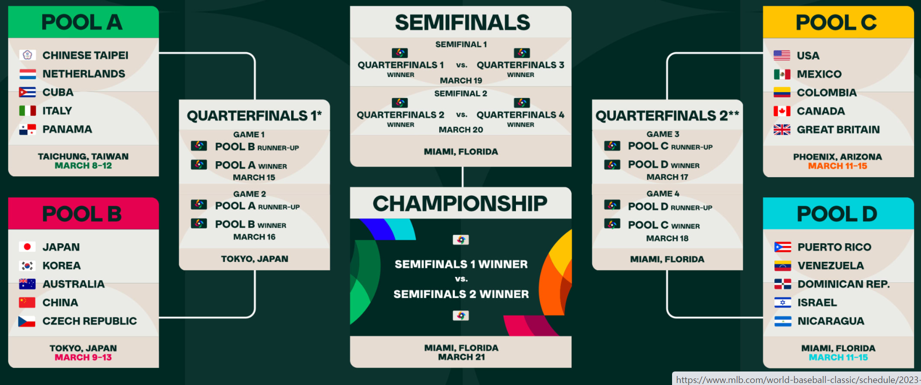 - 역대 월드 베이스볼 클래식에서는 본선 2라운드(8강전)까지 리그제로 대회가 진행되었는데[10] 이번 대회는 본선 2라운드(8강전)부터 녹아웃 토너먼트(단판전)으로 진행됩니다.
