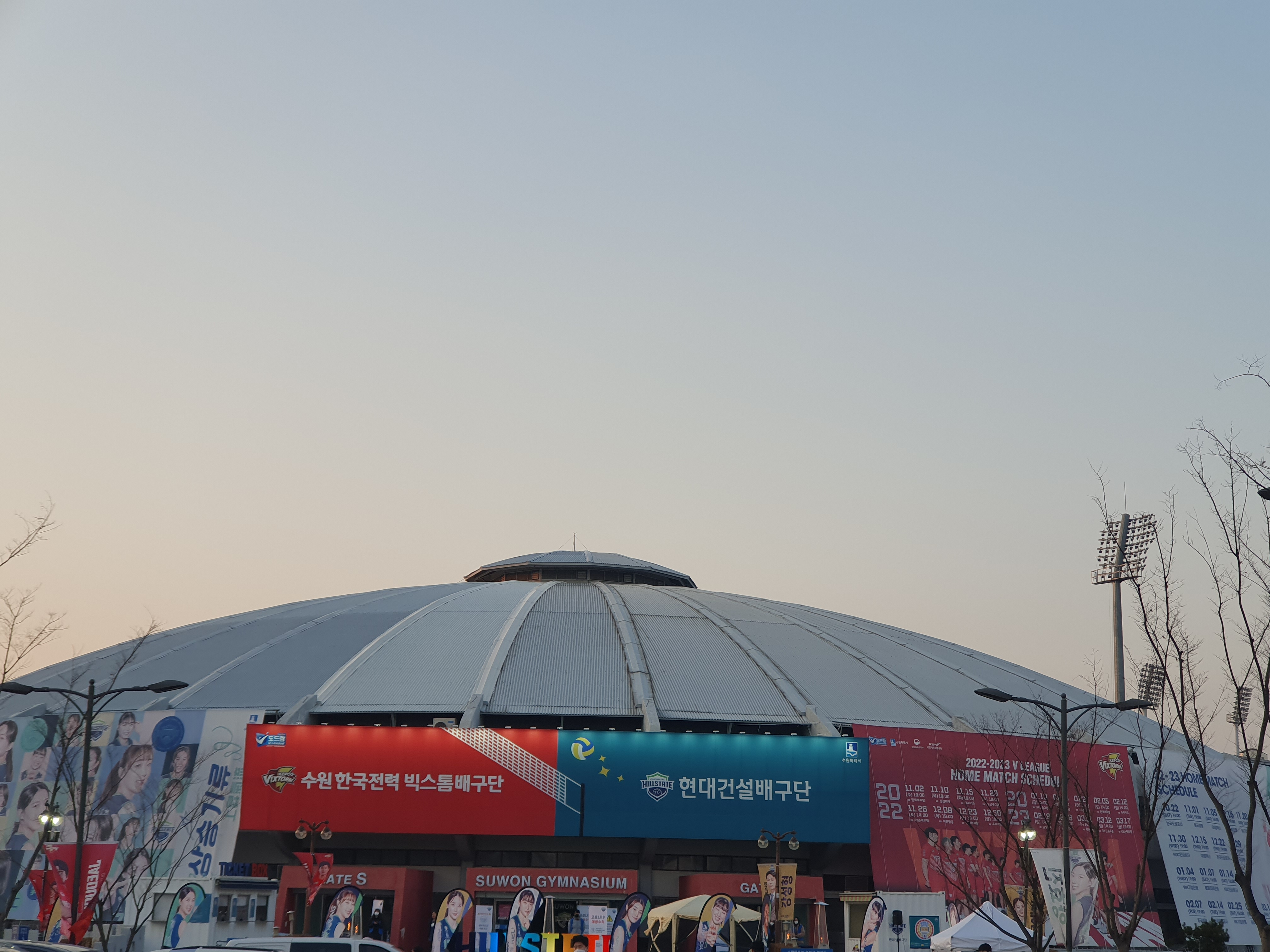경기장 밖의 모습입니다. 한국전력과 현대건설이 같이 수원 경기장을 홈으로 쓰고 있습니다. 물론 한국전력 경기도 직관한 적 있는데요. 남자 배구와 여자 배구는 나중에 직관해 보시면 알겠지만, 느낌이 많이 다릅니다. ^^ 여배가 확실히 아기자기합니다.